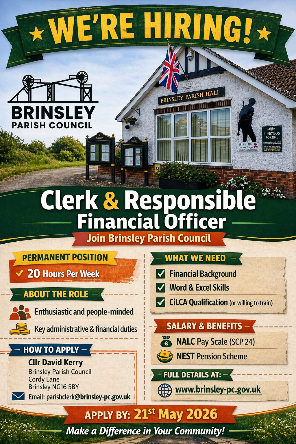 Brinsley Parish Council is seeking a motivated and community-focused individual to take on the role of Clerk and Responsible Financial Officer (RFO). This is a permanent position at the heart of local governance, offering the opportunity to make a real difference within the parish.